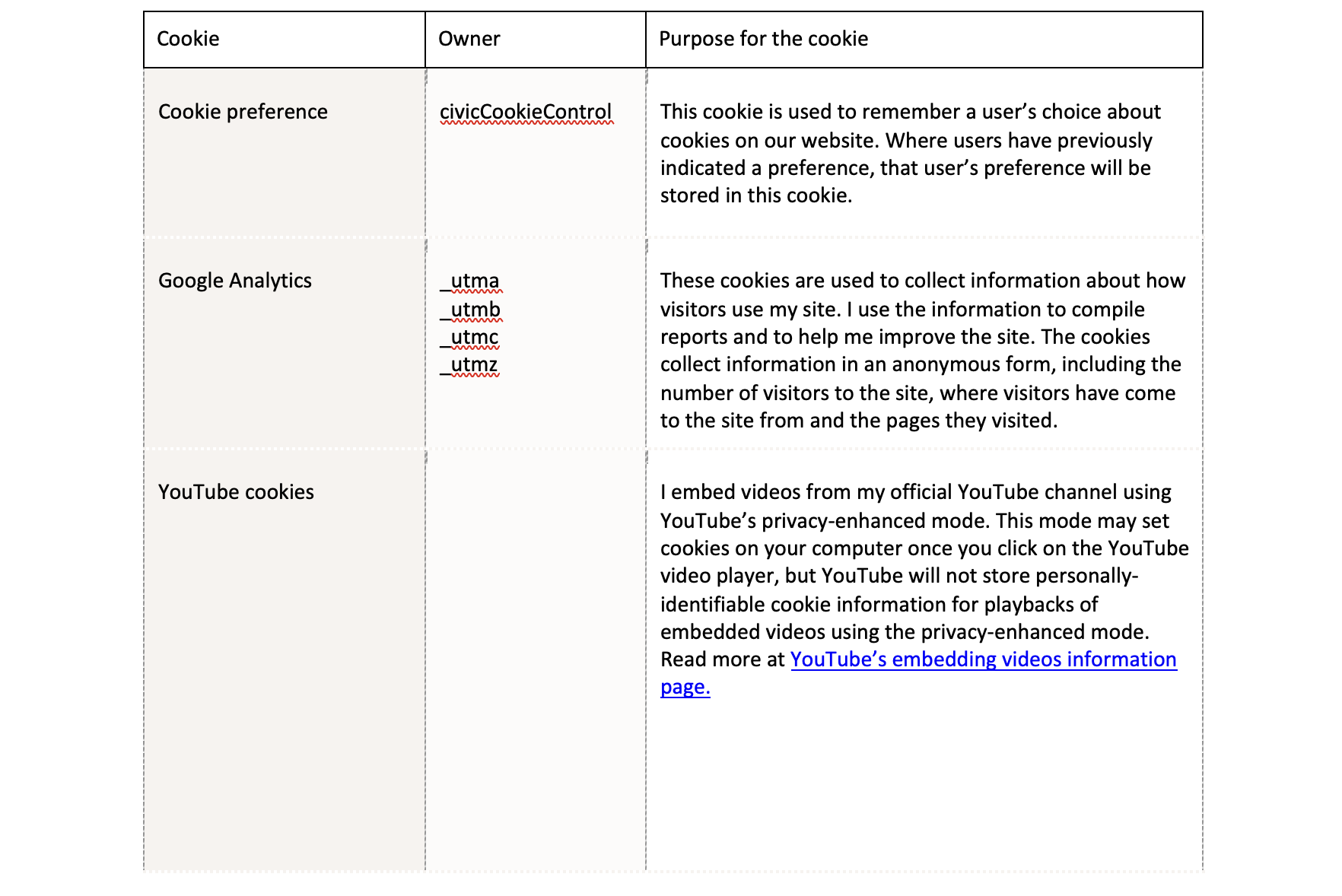 • Functionality cookies. These are used to recognise you when you return to our website. This enables me to personalise our content for you, greet you by name and remember your preferences (for example, your choice of language or region).
